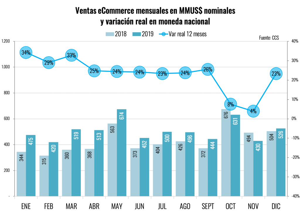 Luego de cerrar el año en medio de un complejo último trimestre, el comercio electrónico chileno alcanzó los US$ 6.079 millones durante 2019, según estimaciones de la Cámara de Comercio de Santiago. La cifra se ubica por primera vez en la historia por debajo de la proyección previa de la CCS, que rondaba los US$ 7 mil millones, debido principalmente a dos factores: en primer lugar, los hechos de violencia ocurridos a partir del 18 de octubre y el impacto directo e indirecto que tuvieron sobre el consumo. En segundo lugar, la fuerte depreciación del peso, agudizada durante los últimos meses del año.