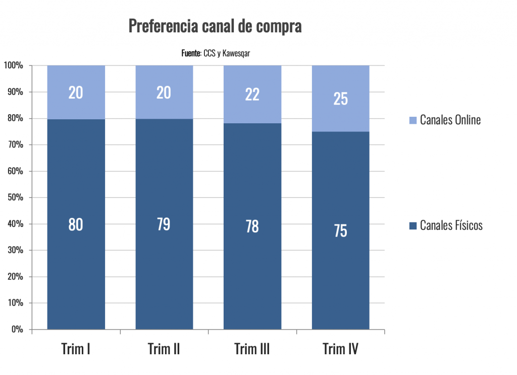 Pese al deterioro en el desempeño del cuarto trimestre, el comercio online siguió ganando participación en las preferencias de los consumidores, lo que se vio reforzado por los graves daños que sufrió el comercio físico a manos de la delincuencia, incentivando el uso de canales de mayor disponibilidad y seguridad para el consumo. De acuerdo a la encuesta trimestral a consumidores que realizan la CCS y Kawesqar, la preferencia por el canal online subió a un 25% de los consumidores, 5 puntos porcentuales por sobre el primer semestre.