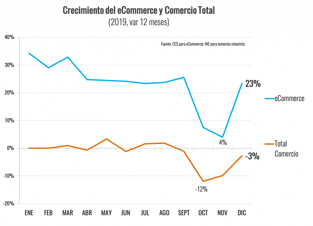 Lo anterior intensificó la tendencia del eCommerce a ganar terreno sobre las ventas minoristas, pasando de un 5,8% del total en 2018 a un 7,4% en 2019. De acuerdo al INE, el año pasado las ventas del comercio minorista disminuyeron un 1,7%, mientras el formato electrónico, pese a su desaceleración, siguió creciendo a tasas de dos dígitos.