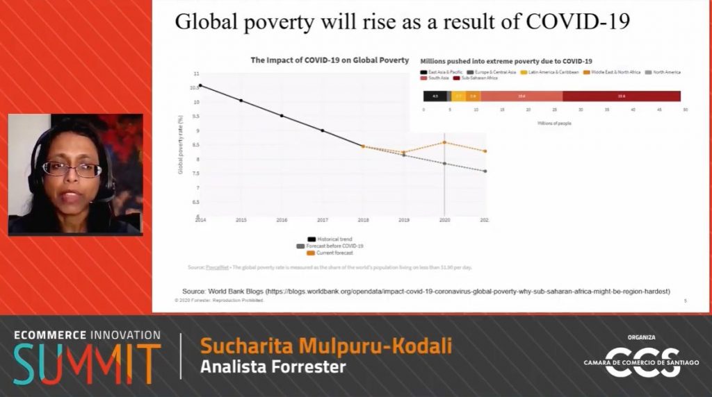 En su presentación, la analista de Forrester, Sucharita Mulpuru-Kodali, destacó que en Estados Unidos, las ventas del retail online han crecido 16% interanual y se espera que mantenga tasas de crecimiento de dos dígitos, pero no a los niveles alcanzados este año durante la pandemia. Agregó que si bien se espera para los retailers offline una caída en sus ventas de 8%, para 2021 las cifras se revertirán. Sin embargo, señaló que el mejor escenario será en 2023, aunque más bajo de lo que se había proyectado antes de la pandemia.