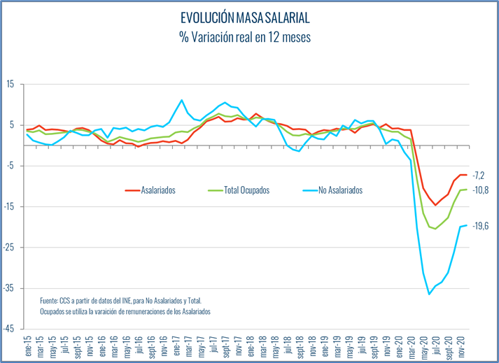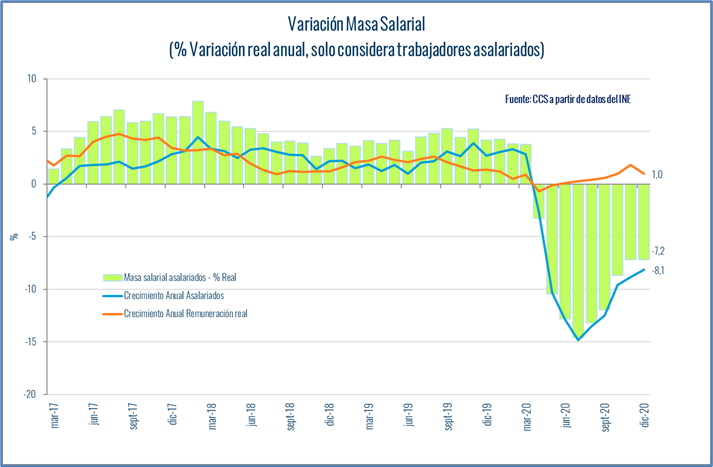 Según las estimaciones de la CCS en base a los datos entregados por el INE, la masa salarial cayó un 7,2% en 12 meses en diciembre de 2020, manteniendo el registro del mes anterior luego de 4 meses de moderación en su tasa de descenso. Con este resultado, 2020 cerró con un descenso promedio del 6,5% real en la masa salarial, por lejos el más alto desde que se mide este indicador.