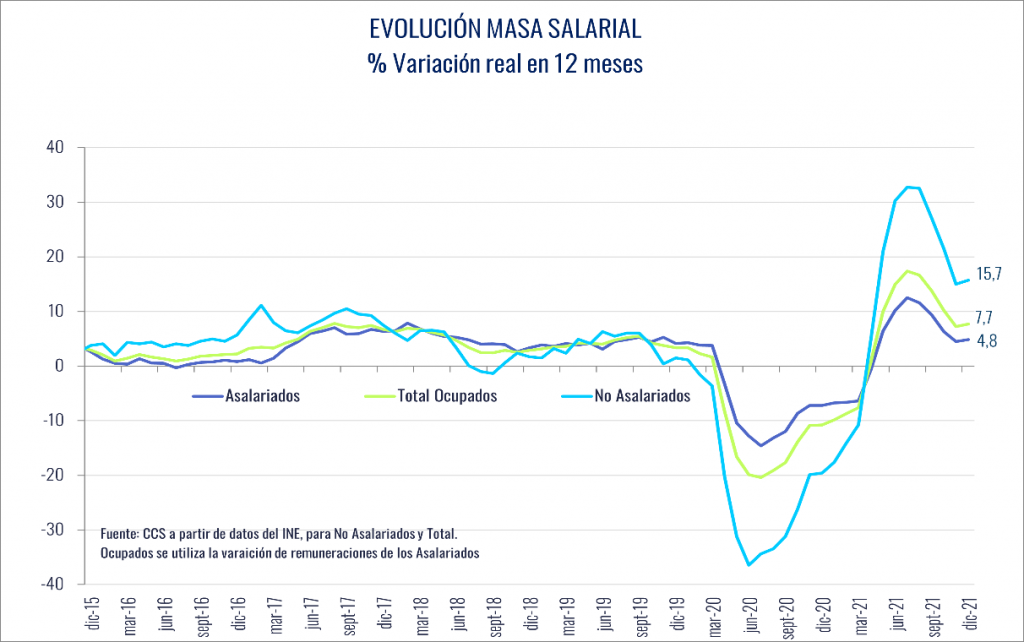 De acuerdo con las estimaciones de la CCS, se espera que durante el primer trimestre de 2022 el crecimiento de la masa salarial se estabilice en torno a las cifras recientes, con bases de comparación aún bajas, que tenderán a normalizarse a partir de mayo. Los altos niveles que mantiene la inflación seguirán minando la capacidad de fortalecer este proceso, por lo que el crecimiento del número de ocupados seguirá siendo la principal fuerza a favor de la masa salarial total.