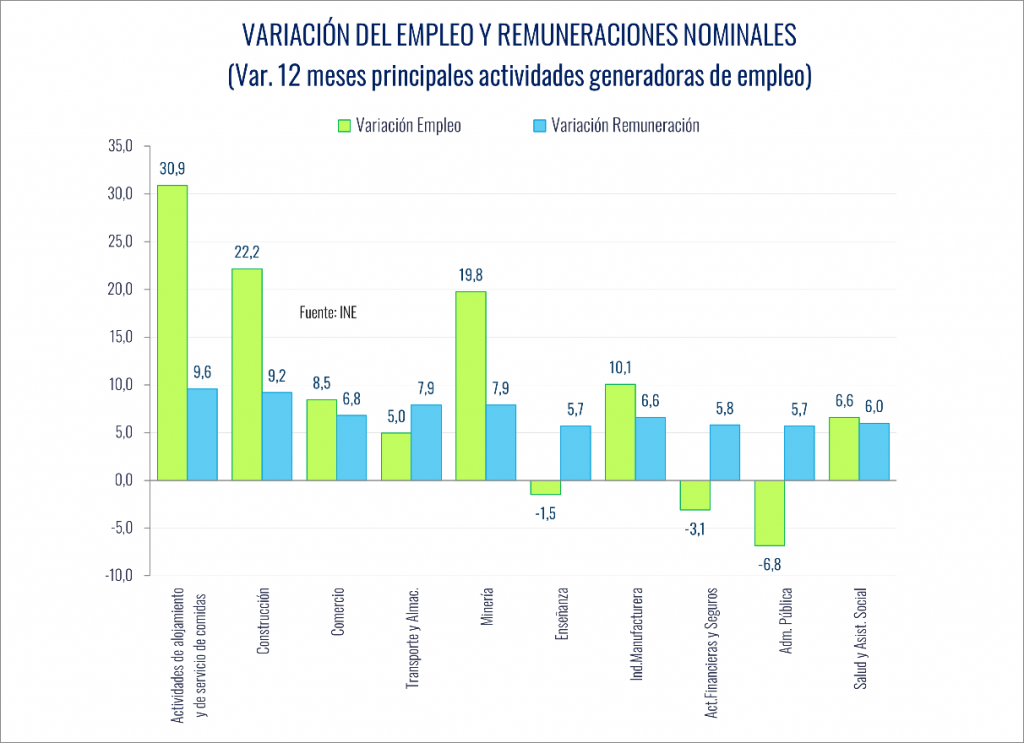 En este último trimestre móvil las cifras de empleo muestran una recuperación de 645 mil puestos de trabajo en 12 meses, liderada por la construcción y el comercio, con 145 mil y 131 mil ocupaciones, respectivamente. Las actividades de alojamiento y comidas mantienen su tendencia de crecimiento sostenido, registrando 87 mil nuevas ocupaciones en el trimestre móvil terminado en diciembre.