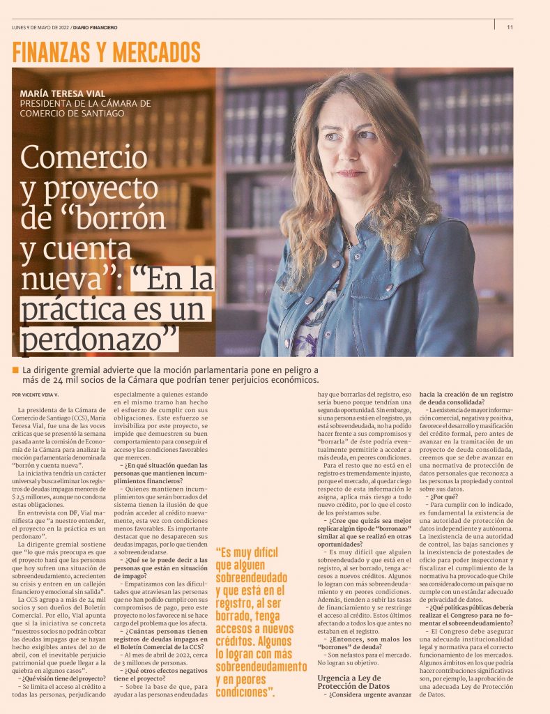 DIARIO FINANCIERO – La presidenta de la Cámara de Comercio de Santiago (CCS), María Teresa Vial, fue una de las voces críticas que se presentó la semana pasada ante la comisión de Economía de la Cámara para analizar la moción parlamentaria denominada ‘borrón y cuenta nueva’.