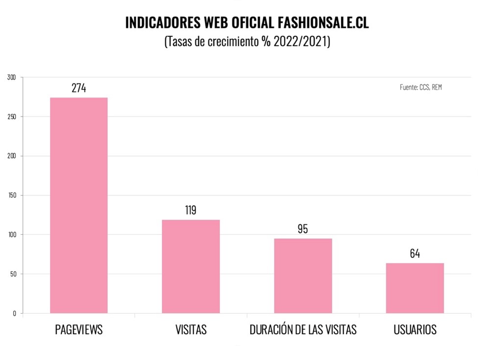 Si bien no se dispone de cifras comparativas sobre las transacciones, las visitas a la web oficial del evento www.fashionsale.cl aumentaron un 119%, reflejando el gran interés de los consumidores por participar en el evento, que incluyó ofertas en las categorías de belleza, vestuario y calzado, infantil, accesorios y moda, ropa interior, deportes y outdoor, equipaje, bolsos y mochilas.