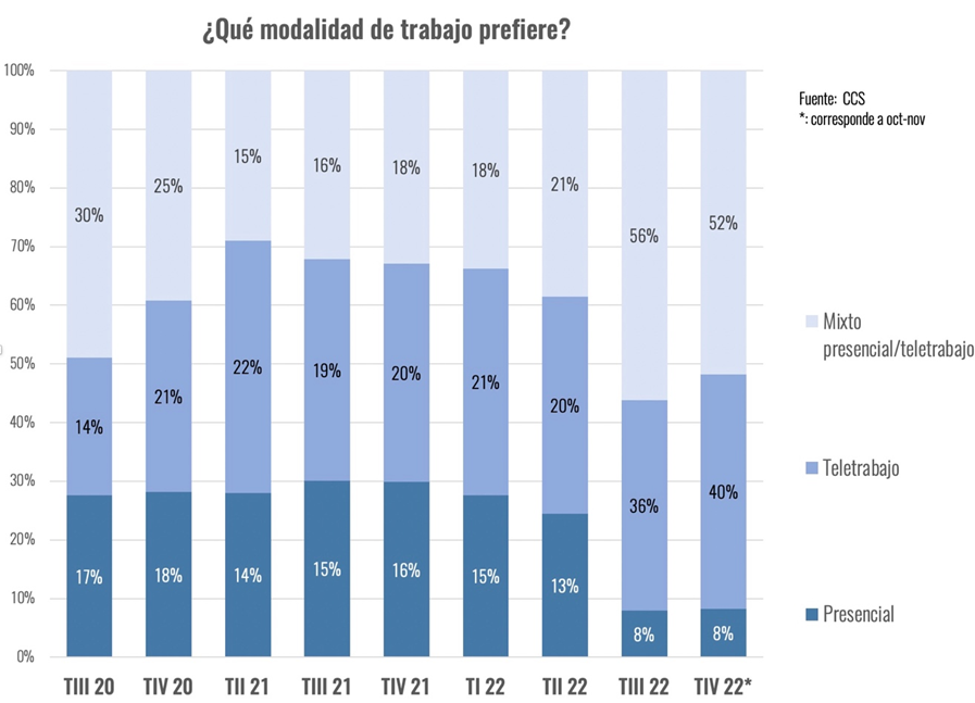 La proporción que se declara a favor de teletrabajar experimentó un fuerte aumento en los últimos 2 trimestres. Hasta mediados de este año, se mantenía por debajo del 90%.