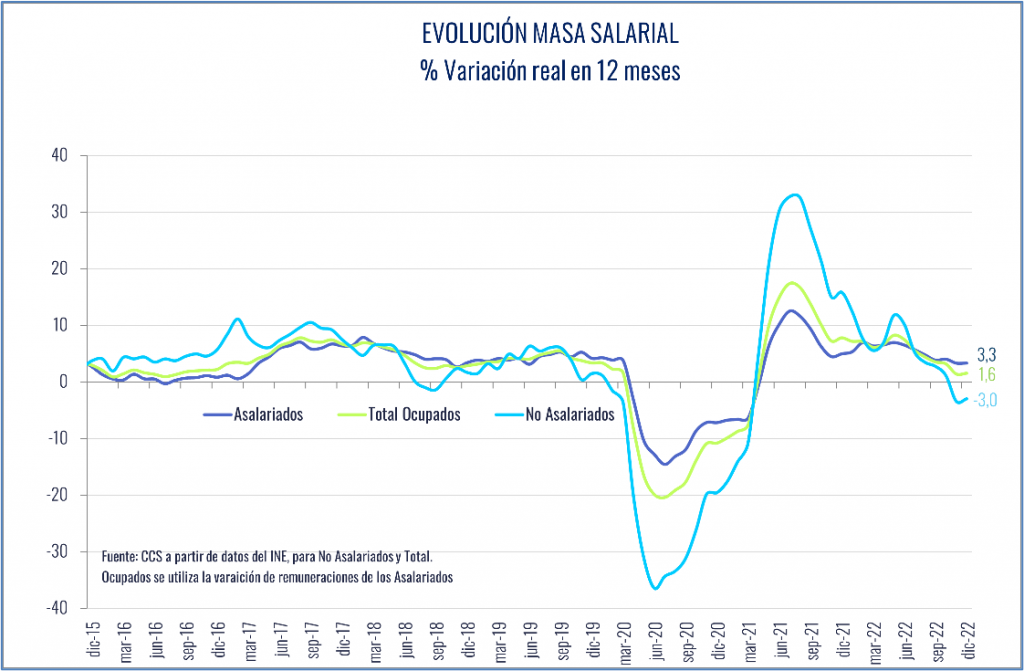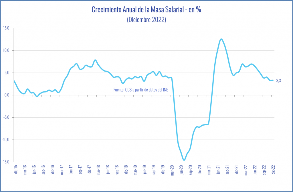 De acuerdo con las estimaciones de la Cámara de Comercio de Santiago (CCS), a partir de las últimas cifras sobre el mercado laboral entregadas por el INE, la masa salarial cerró 2022 con un crecimiento del 3,3 real en diciembre, repitiendo la cifra de noviembre, siendo ambas las más bajas de todo el año. De esta forma, se confirma la prolongada tendencia a la desaceleración del indicador, que había llegado a crecer por sobre el 10% a mediados de 2021.
