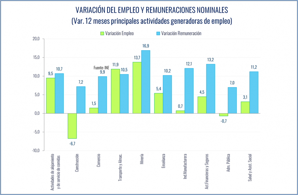 Respecto a las remuneraciones nominales, los mayores incrementos se dieron en minería (16,9%), actividades financieras y de seguros (13,2%), industria manufacturera (12,1%), salud y asistencia social (11,2%), las actividades de alojamiento y alimentación (10,7%), y el comercio (9,9%).