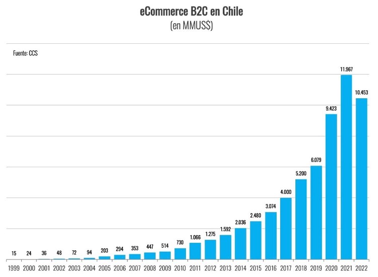 Esta contracción llegó a ser una de las más severas a nivel global, lo que se debe a una conjunción de factores, como el retroceso de la demanda en consumo debido a la disminución de ingresos por subsidios de emergencia y retiros de pensiones, la alta inflación y alzas de tasas de interés, las altísimas bases de comparación que estableció el año récord 2021, y el retorno a la movilidad -que impulsó las compras en tiendas físicas- luego de las severas restricciones impuestas durante la pandemia. Si bien la cifra en el mercado nacional representa un retroceso frente al boom de 2021, su valor supera con creces los montos de 2019, e incluso los de 2020, reflejando el desarrollo alcanzado por el e-commerce chileno en los últimos años.