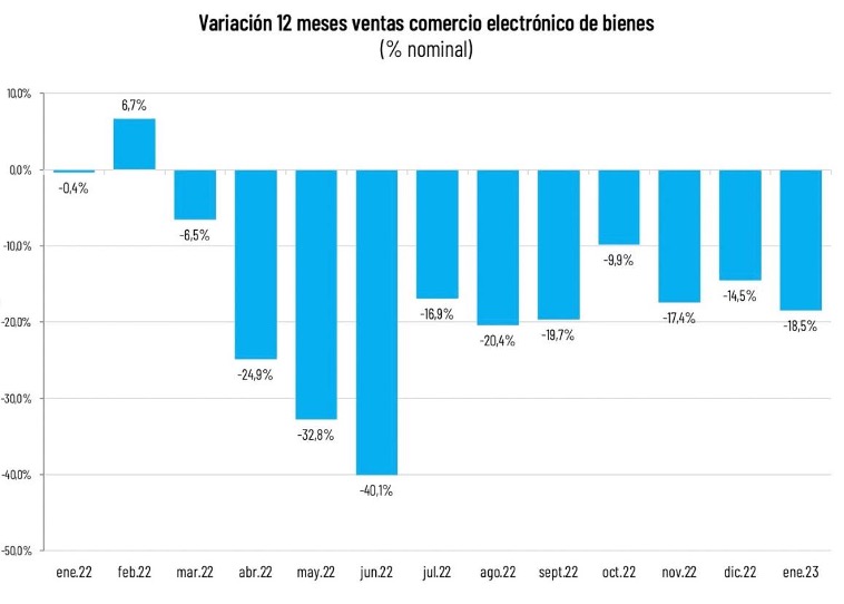 El 2023 inició, de hecho, con una caída del 18,5% nominal en 12 meses durante enero. El rubro tecnológico moderó su caída a un 14% en 12 meses. Hogar, en tanto, cayó un 30% y vestuario y calzado un 7%.