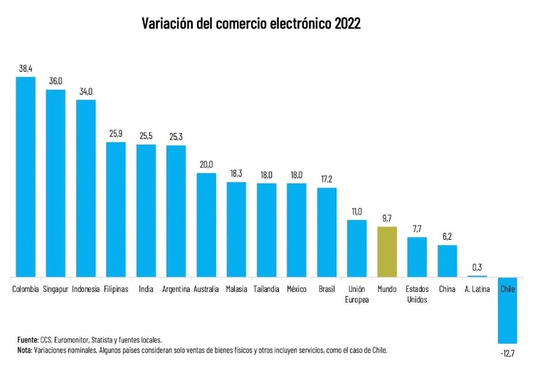 En la comparación global, Chile aparece entre los desempeños más bajos de 2022, luego de haber estado entre los más dinámicos en los dos años previos. América Latina y Asia destacaron como regiones de alto crecimiento, alcanzando el primer lugar Colombia, con una expansión de las ventas online de 38% en 2022, seguido por Singapur (36%), Indonesia (34%) y, a alguna distancia, Filipinas, India y Argentina, todos en torno al 25%. En el caso del país vecino, sin embargo, su altísima inflación se traduce en una variación real negativa en las ventas.