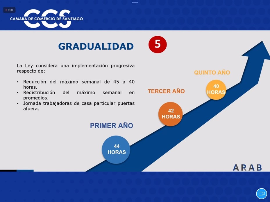 Fernando Arab, socio de Arab abogados, explica que la reducción de la jornada ordinaria máxima de trabajo a 40 horas será en un plazo de 5 años. “La gradualidad establece que al primer año de vigencia de la ley se reducirá a 44 horas, al tercer año se rebajará a 42 horas y al quinto año de vigencia llegará a 40 horas semanales. En tanto, la jornada parcial deja de ser 2/3 de la jornada ordinaria pasando a ser aquella que no excede de 30 horas semanales”.