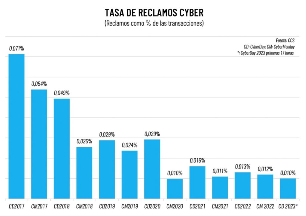 Lo anterior contribuyó a mantener elevados estándares de satisfacción por parte de los consumidores, lo que se ve reflejado en las bajas tasas de reclamos. De acuerdo a la última información sobre reclamos publicada por el Sernac al primer día del evento, la tasa de reclamos se ubicó en torno a un 0,01%, la más baja de la historia junto a la observada en el CyberMonday 2020.