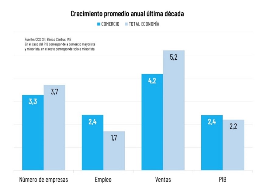 Durante los últimos 10 años, el número de empresas el comercio minorista ha crecido a un ritmo anual promedio del 3,3%, levemente por debajo del total de la economía (3,7%). Pese a ello, la creación de empleo del sector ha sido más dinámica: un 2,4% anual promedio vs un 1,7%. Las ventas, en tanto, han aumentado a un ritmo anual del 4,2%, y el producto interno bruto sectorial lo ha hecho al 2,4% a partir de 2011.