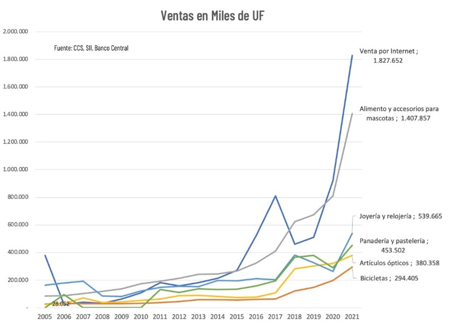 Otra área de gran crecimiento ha sido el rubro de productos para mascotas. Sus ventas se han multiplicado por 7 veces desde 2011, a un ritmo anual del 22%, y la cantidad de comercios especializados en el rubro ha aumentado desde poco más de 2 mil ese año hasta más de 7 mil en 2021.