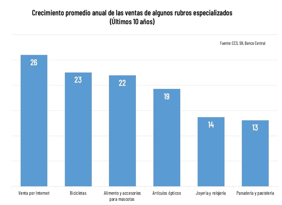 Otras áreas de rápido crecimiento son el comercio especializado en artículos ópticos, joyería y relojería, panadería y pastelería, todas con altas tasas de expansión.