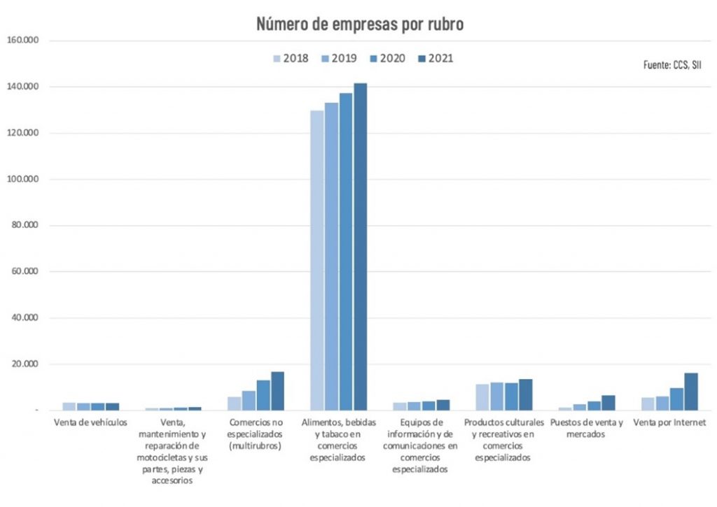 El rubro más poblado de empresas del sector es el alimenticio (incluidos bebidas y tabaco), con sobre 140 mil comercios especializados, casi un 40% del total). A nivel agregado, sin embargo, los que más crecen en cantidad de empresas son los comercios no especializados o multirubro.