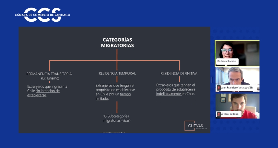 La Cámara de Comercio de Santiago (CCS) realizó este martes 03 de octubre, el webinar “La Contratación de Extranjeros en Chile”, liderado por Barbara Román Yáñez, abogada y actualmente responsable del área Migratoria en Cuevas Abogados y a cargo de la Golden Visa, y por Álvaro Bellolio, director de la Escuela de Gobierno de la Universidad Andrés Bello y ex Director Servicio Nacional de Migraciones.