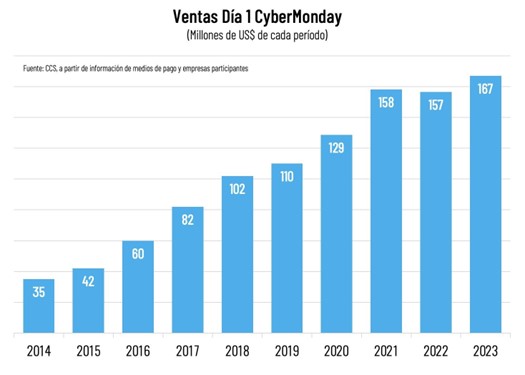 De acuerdo a estimaciones de la Cámara de Comercio de Santiago (CCS), organizadora del evento,  el Cyber Monday 2023 registró compras por US$ 167 millones en su primer día de ofertas. La cifra supera en un 7% los US$ 157 millones del primer día del año pasado, aunque al ajustarla por inflación en moneda local representa un descenso del 6% real en igual período.