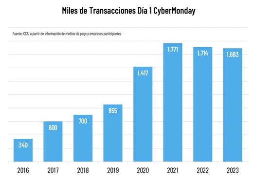 El total de transacciones, en tanto, se ubicó cercano a los 1,7 millones, cifra similar a la observada en los dos Cyber Mondays anteriores.