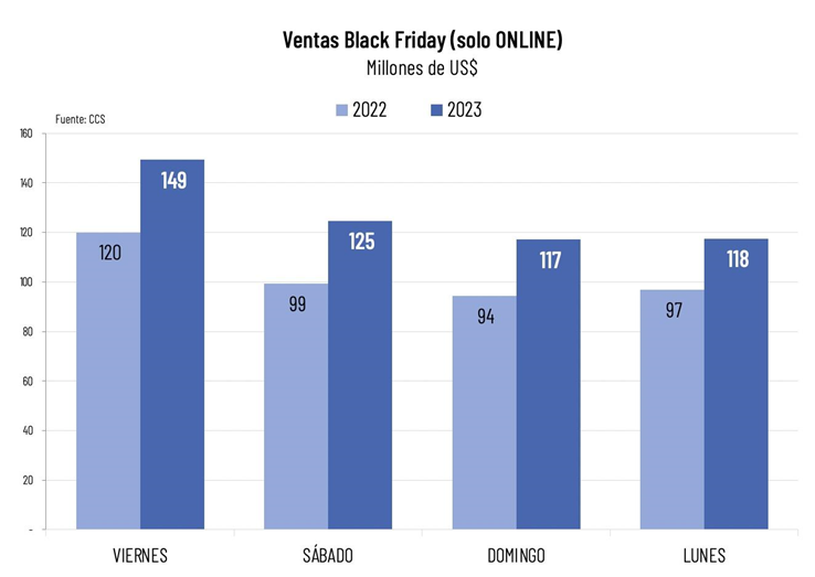 Si bien aún no se conocen las ventas totales del Black Friday incluyendo tiendas físicas, la CCS estimó que éstas podrían haber alcanzado los mil millones de dólares, con una participación del comercio electrónico en torno al 50% del total, y un crecimiento superior al 20% en 12 meses.