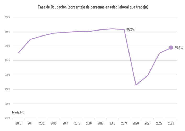 La tasa de empleo (el porcentaje de personas en edad laboral que se encuentra ocupado), llegó a poco menos de 56%, aún sin recuperar sus cifras previas a la pandemia (58%). Si se hubiese mantenido la tasa de ocupación previa, la economía había creado unos 300 mil empleos adicionales, y la tasa de desempleo estaría por debajo del 7%.