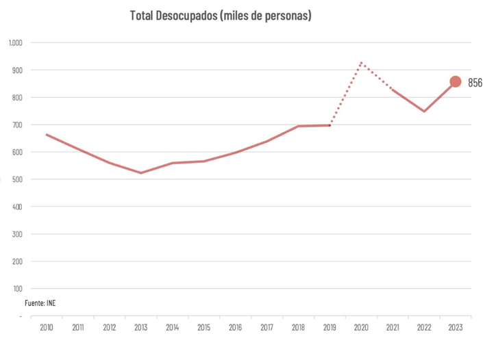 Con la información entregada este martes por el INE, es posible completar el balance anual del mercado laboral en 2023. De acuerdo con la Cámara de Comercio de Santiago (CCS), los resultados son alarmantes: la tasa de desempleo promedió un 8,6%, su nivel más alto de los últimos 18 años, descontando la pandemia. El número de desocupados creció a tasas de 2 dígitos (14%) para llegar a un promedio de 856 mil, el más alto de la historia después de 2020, en que se produjo un pérdida masiva de empleo por el cierre de actividades productivas originado en pandemia. Y si bien el total de empleo también alcanzó máximos históricos, su nivel muestra un evidente rezago respecto del PIB.