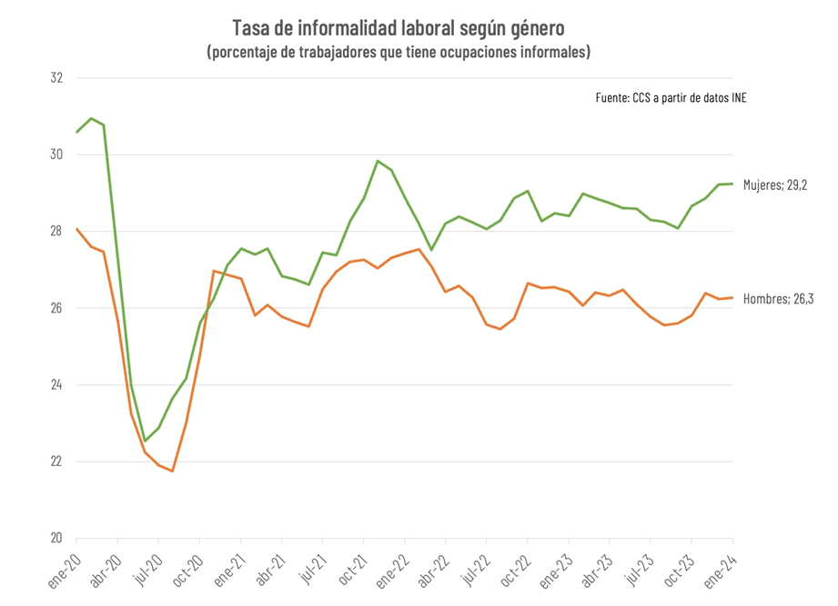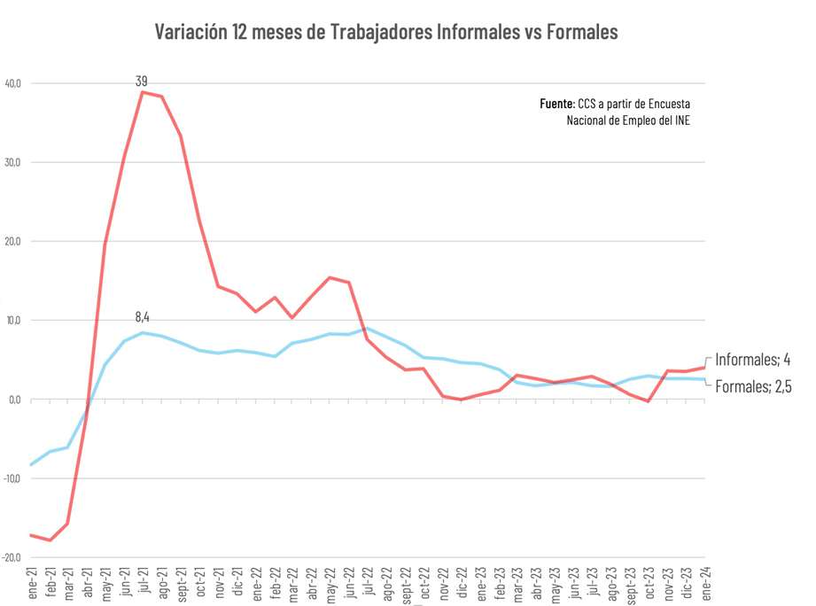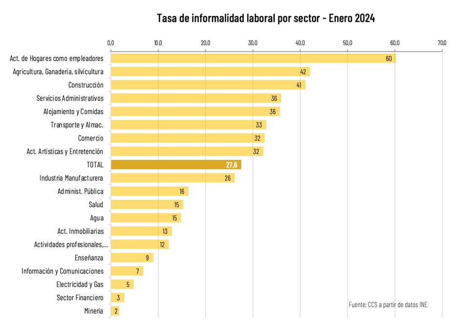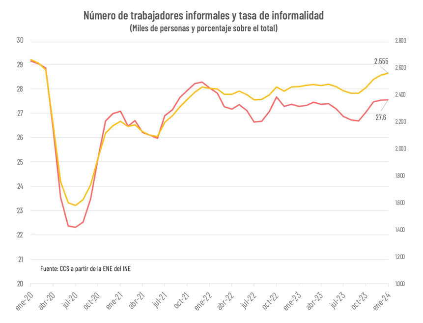 De acuerdo a un informe del Observatorio de Informalidad Laboral de la CCS, basado en la Encuesta Nacional de Empleo del INE, el número total de trabajadores informales superó los 2,5 millones de personas en enero de este año, su nivel más alto en 4 años, lo que se tradujo en una tasa de informalidad del 27,6%.