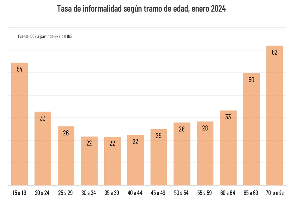 En el caso de los mayores, la informalidad va en aumento a medida que aumenta la edad, desde un 28% para personas entre 50 y 59 años, a un 33% entre los 60 y 64, un 50% entre 65 y 69, y un 62% a partir de los 70 años.