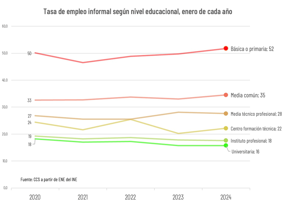 Para personas con instrucción básica, la tasa de informalidad supera el 50%, muy por sobre el promedio, alcanzando a cerca de 580 mil personas. Los trabajadores con educación media, pese a tener una tasa de informalidad inferior (35%, igualmente sobre el promedio país), representan un número muy superior de personas, que llega a cerca de un millón de ocupados informales en enero (969 mil).