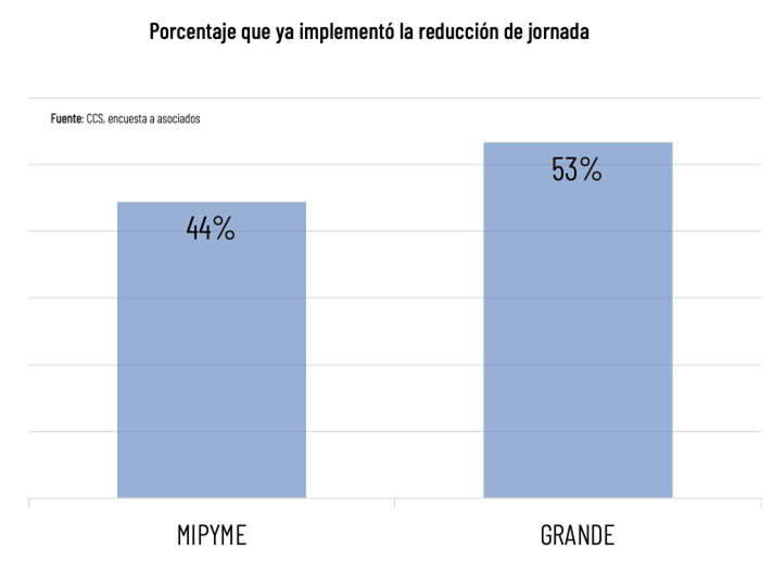 Del total de la muestra, la mitad señala que ya implementó la reducción de jornada, mientras la otra mitad lo hará a partir de este viernes. En el caso de las MiPymes, el 44% declara ya haber adelantado la aplicación de la norma, porcentaje que sube al 53% entre grandes empresas.