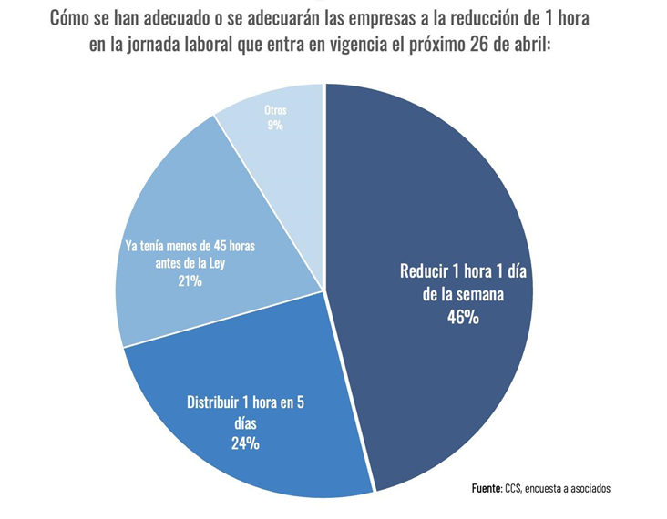 De acuerdo con el sondeo de la Cámara de Comercio de Santiago (CCS) aplicada a una muestra de 118 asociados, las empresas han adoptado distintas aproximaciones para adecuar sus esquemas de trabajo a la normativa. Así, un 46% de las consultadas ha optado por reducir una hora un día de la semana, mientras que un 24% utilizará la distribución proporcional de esa hora durante la toda la semana laboral.
