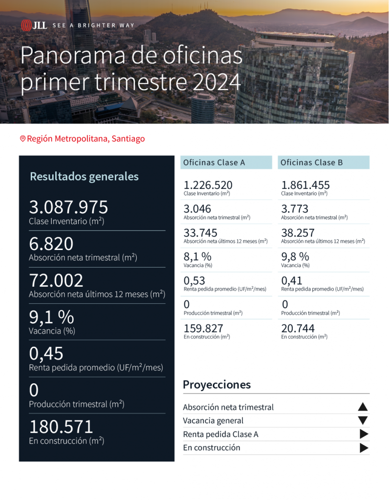 Según el informe trimestral de oficinas de JLL Chile, por cuarto trimestre consecutivo la vacancia general mantiene su tendencia a la baja, registrándose un valor de 9,1 % y un descenso de 2,4 puntos porcentuales entre el primer trimestre de 2023 y el primer trimestre de 2024. En cuanto a la vacancia para Clases A y B disminuyó un 3 % respecto del trimestre anterior, cerrando el período en 8,1 % y 9,8 % respectivamente. La mayor absorción neta se registró en el submercado de Providencia, mayoritariamente en Clase A.