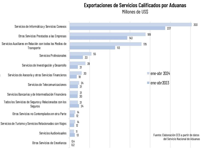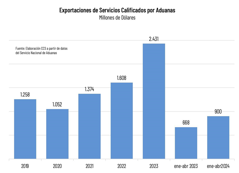 El gran dinamismo observado en los últimos años se extiende también a los primeros meses de 2024. En efecto, entre enero y abril, los servicios calificados como exportación por Aduanas se han expandido un 35% respecto a igual período del año pasado, superando los US$ 900 millones.