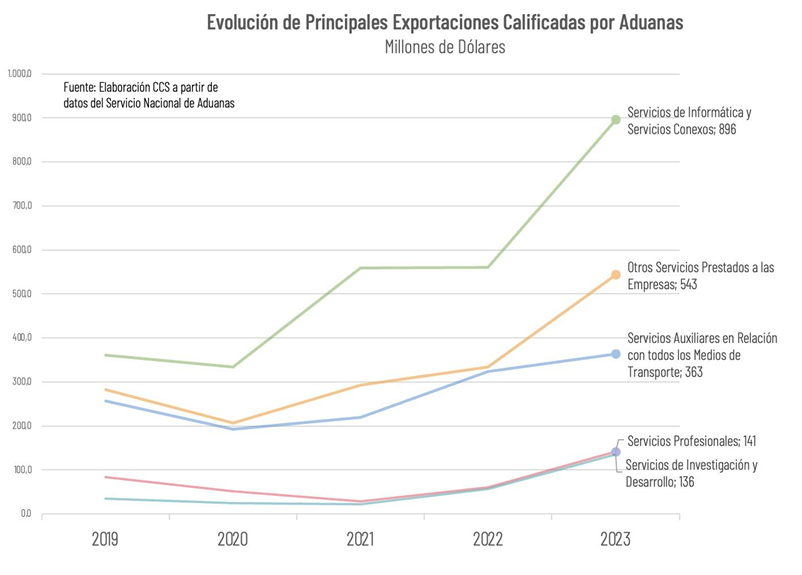 Este fuerte incremento en los registros del Servicio Nacional de Aduanas es explicado principalmente por el significativo dinamismo de las exportaciones de servicios de informática y servicios conexos, que en 2023 bordearon los US$ 900 millones, un 150% por sobre lo registrado en 2019. Se debe, también, al incremento de las ventas de servicios empresariales, que se empinaron a los US$ 543 millones en 2023, casi duplicando la cifra del año 2019.