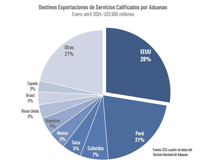 Respecto de los destinos, el principal mercado corresponde a Estados Unidos, con un 28% del total, destacando los servicios de suministro de hosting, apoyo técnico en computación, diseño de software y servicios de filmación de películas. Le sigue Perú, con un 21%, en exportaciones de servicios de mantenimiento y reparación de aviones y helicópteros, apoyo técnico en computación e informática, asesoría en proyectos de ingeniería, gestión en marketing y servicios de ingeniería para la minería del cobre.
