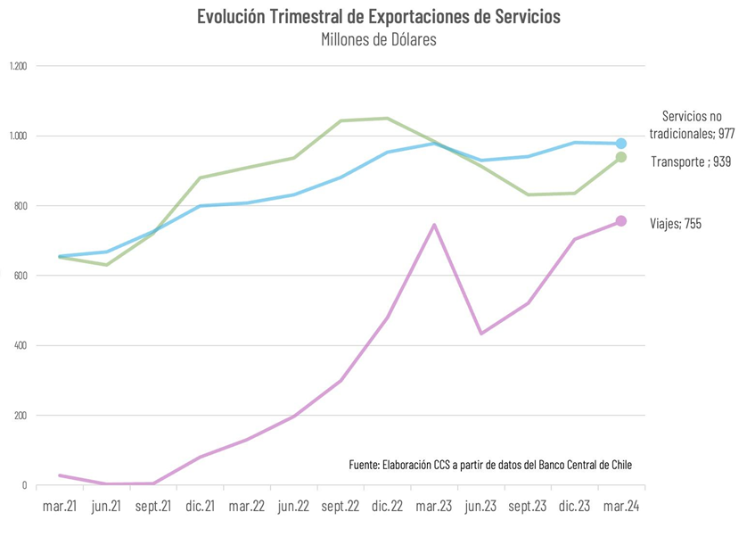También explican este crecimiento, pero en menor medida, las exportaciones de servicios de telecomunicaciones, informática e información, que se han expandido sostenidamente en los últimos años, alcanzando US$ 152 millones en el primer trimestre de 2024, un 35% por sobre el mismo período de 2021.