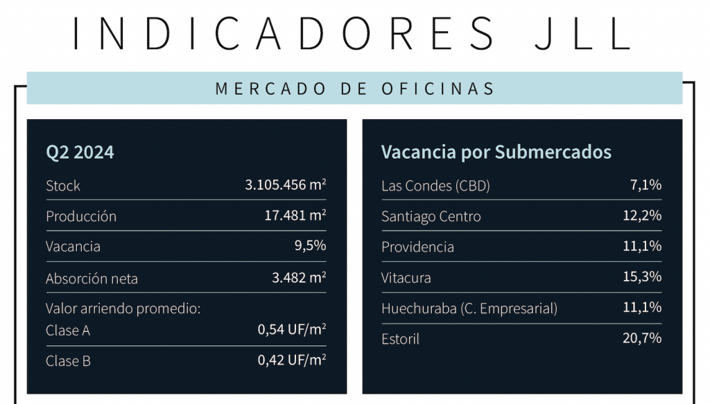 La absorción neta total del trimestre fue de 3,482 m², alcanzando 10,301 m² en lo que va del año, pero por otra parte, existen otros submercados que continúan en un periodo de desocupación, como por ejemplo Santiago Centro, sector con una tendencia alza, esto debido a la evolución del mercado post pandemia y la preferencia por otros sectores como Las Condes.
