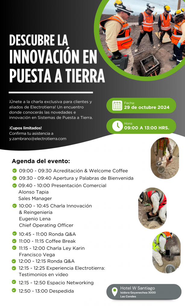 - Innovación y tecnología: Conoce la propuesta innovadora de Electrotierra. Alonso Tapia y Eugenio Lena, destacados ejecutivos del área técnica y comercial, detallarán las características y beneficios de su solución en sistemas de puesta a tierra.