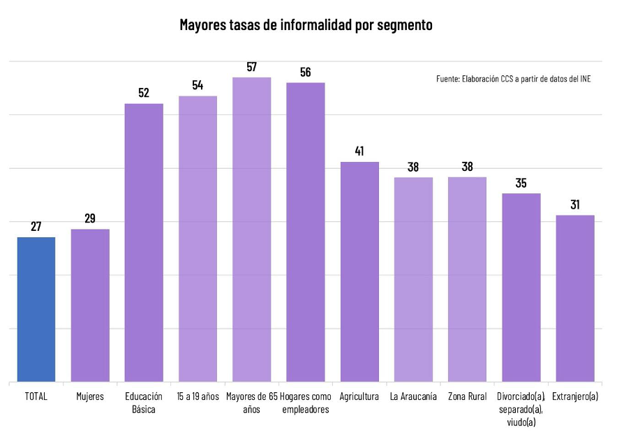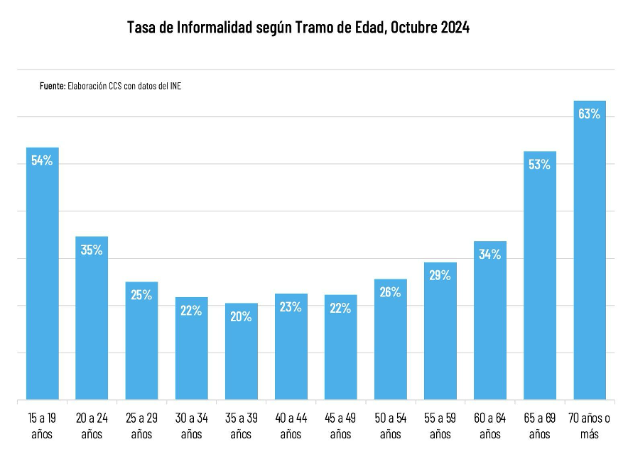 De acuerdo al Reporte del Observatorio de Informalidad Laboral de la CCS, destaca que en el sector de los más jóvenes, inciden factores como el menor nivel educacional, las altas tasas de desempleo juvenil, mayor vulnerabilidad a ciclos de menor generación de empleo y las rigideces del marco regulatorio.