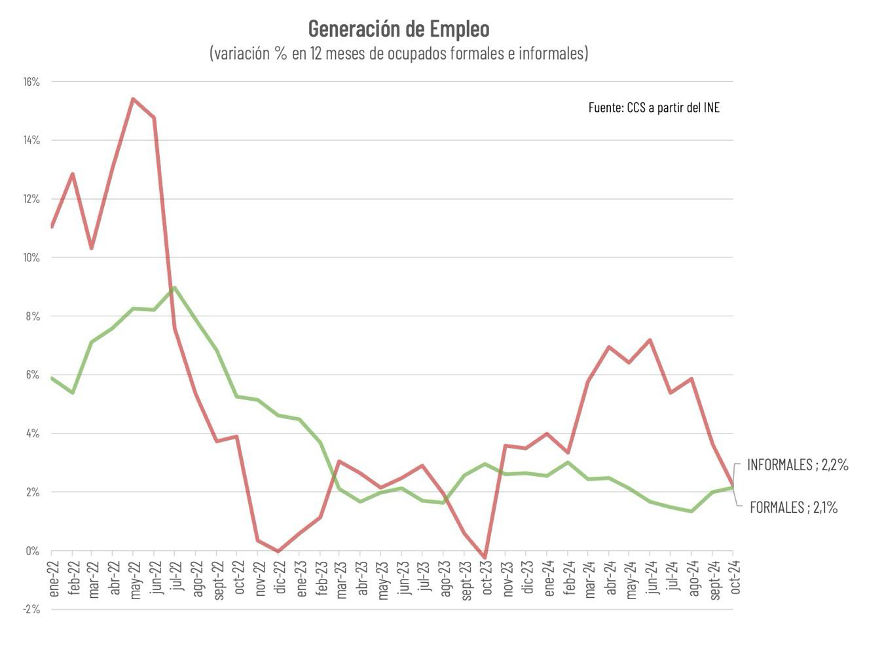 El Observatorio de Informalidad Laboral de la Cámara de Comercio de Santiago (CCS) presentó un nuevo reporte sobre la base de los últimos datos publicados por el Instituto Nacional de Estadísticas (INE). De acuerdo con la Encuesta Nacional de Empleo desarrollada por el INE, el número total de trabajadores informales habría llegado a 2,5 millones de personas en el trimestre móvil terminado en octubre, lo que equivale al 27,1% del empleo total (27% en septiembre).