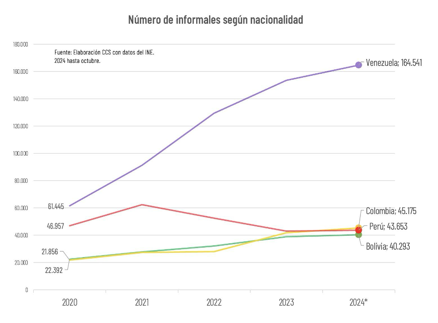 Entre los trabajadores de nacionalidad extranjera, destacan las altas tasas de informalidad en el caso de las personas provenientes de Bolivia, que pese a un descenso en lo que va del año marcan una proporción sobre el 45%, muy superior al promedio de 27% del mercado laboral.