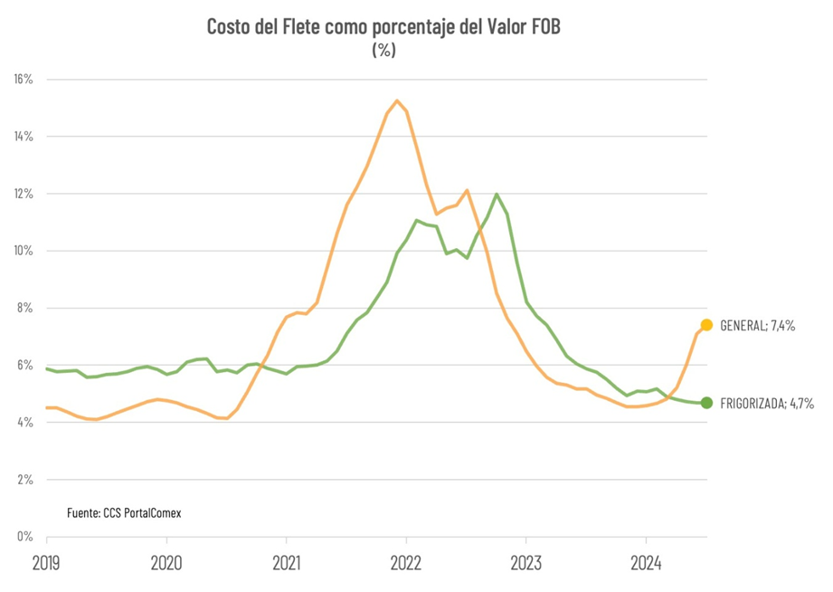 Luego de un extenso período de normalización en los costos del transporte internacional, que se materializó principalmente en el año 2023, durante 2024 se observó un quiebre de dicha tendencia a través de un rebrote de presiones alcistas, que hicieron subir en un 85% el costo promedio de los fletes marítimos de importación.