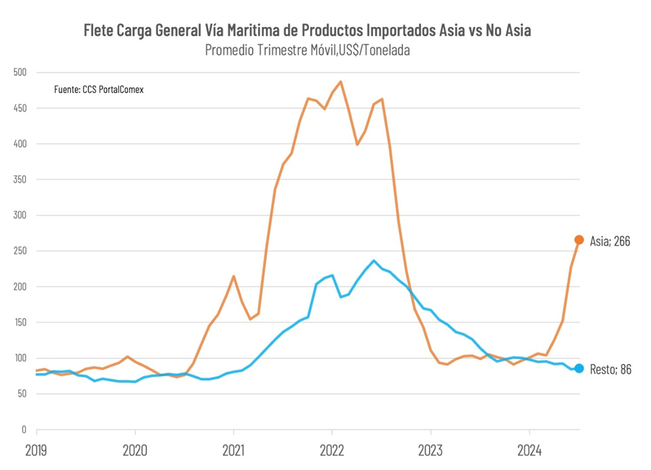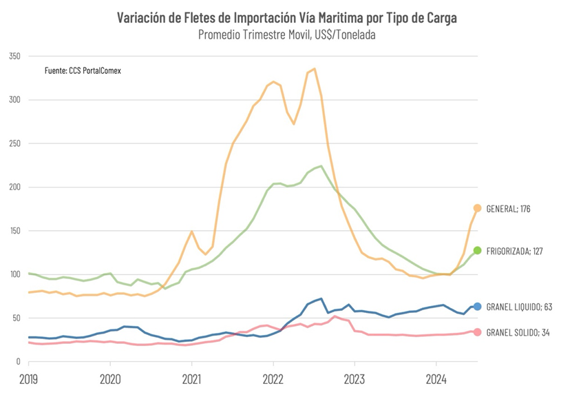 La contingencia de altos fletes se explica por el significativo incremento de los costos de transporte de los productos adquiridos en Asia, que en el tercer trimestre de este año promediaron los US$266/ton, más de 3 veces por sobre la tarifa observada en el comercio con otras regiones. La principal causa de este incremento correspondió a la crisis del Mar Rojo y del Canal de Suez, que obligó a las navieras a tomar rutas alternativas más largas y costosas.