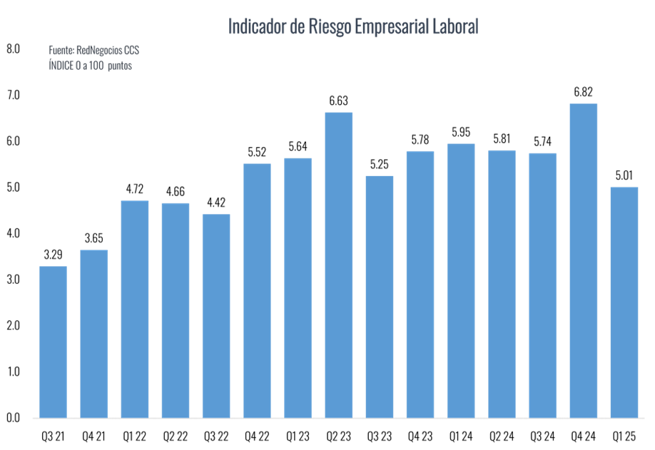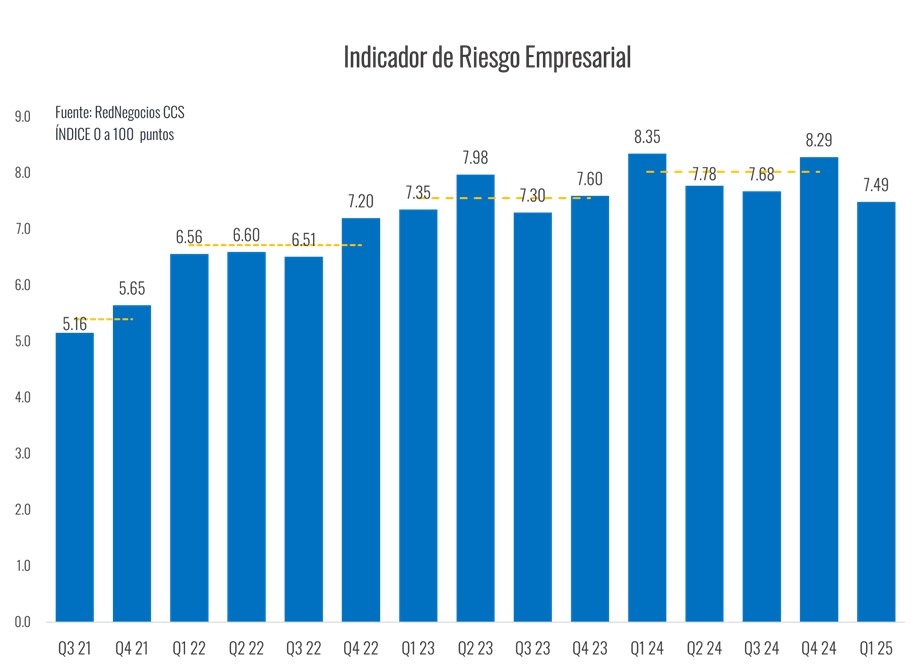 El Índice de Riesgo Empresarial que elabora RedNegocios de la Cámara de Comercio de Santiago (CCS) se ubicó en 7,49 puntos en el primer trimestre de este año, luego de que en a fines de 2024 alcanzara su segundo mayor nivel trimestral desde que se tiene registro. Con ello, el indicador mostró una mejora en el margen, al caer 0,8 puntos en relación al trimestre previo. De cualquier forma, el Índice se ubicó 2 puntos por sobre el promedio de los registros de 2021, año en que comenzó su medición.