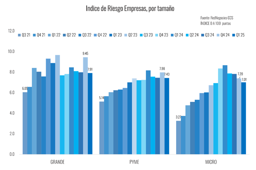 Al descomponer el Índice de riesgo general por tamaño, el segmento de grandes empresas mostró una importante mejoría, al registrar una caída de 1,5 puntos en su indicador, llegando a los 7,91 puntos.