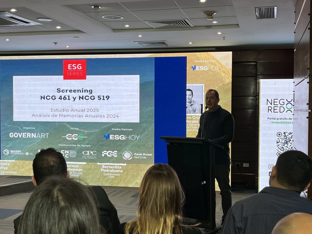 Por su parte, Germán Heufemann presentó los resultados del estudio “ESG Analysis 2025”, elaborado por GovernArt, en el que revisaron las memorias anuales de 29 empresas chilenas, bajo el marco de las NCG 461 y 519. “Este estudio no pretende ser solo una evaluación, sino también una herramienta formativa. Hemos trabajado con distintas entidades, incluyendo el Ministerio de Hacienda, para acompañar a las organizaciones en el proceso de implementación. Lo fundamental es entender que reportar no es el fin, sino un medio para mejorar la gestión y la estrategia”, señaló.