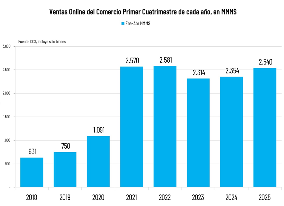 Luego de 2 años de ajuste post pandemia, el comercio electrónico se encuentra en plena recuperación durante 2025, acumulando un crecimiento del 10% promedio en 12 meses durante el primer cuatrimestre del año. De acuerdo a estimaciones de la Cámara de Comercio de Santiago (CCS), las ventas totales del comercio digital de bienes alcanzan a $2.540 miles de millones entre enero y abril, prácticamente igualando los niveles históricos alcanzados en igual período de los años 2021 y 2022, cuando el consumo se volcó masivamente hacia el canal online producto de las restricciones a la movilidad en época de pandemia.