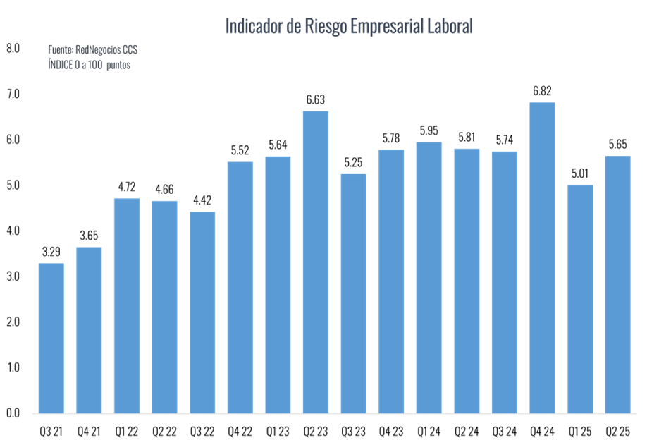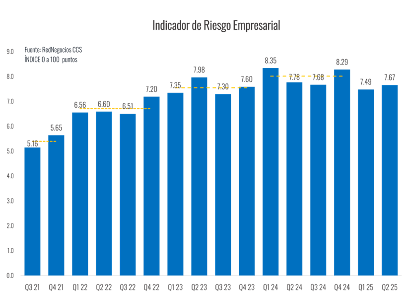 El Índice de Riesgo Empresarial que elabora RedNegocios de la Cámara de Comercio de Santiago (CCS) se ubicó en 7,67 puntos en el segundo trimestre de 2025, registrando un alza de 0,2 puntos en relación al primer cuarto del año y de 2,3 puntos comparado con 2021, primer año de medición.