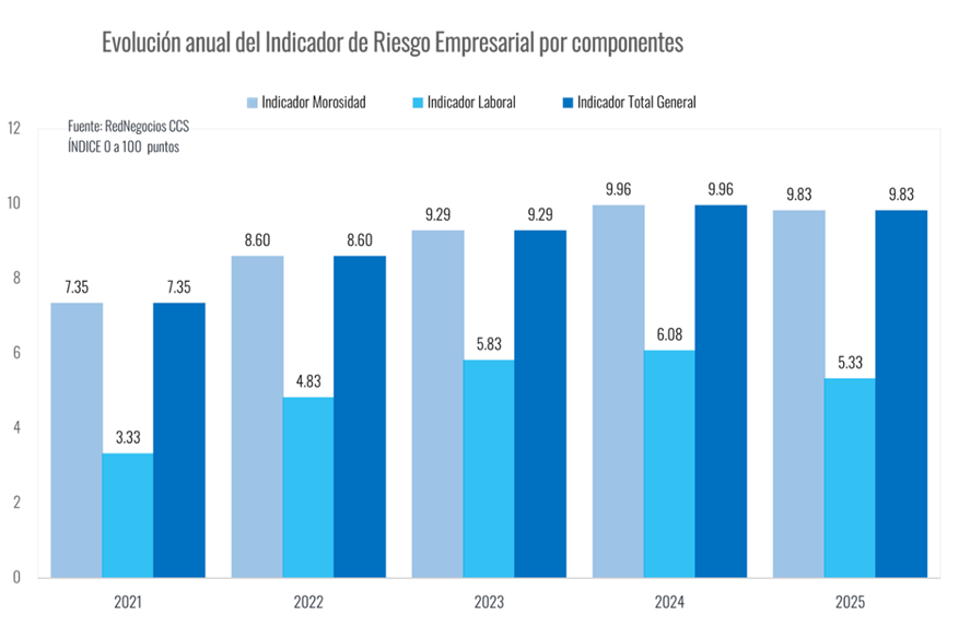 El Índice de Riesgo, que adopta valores entre 0 y 100 puntos, donde 100 representa el mayor nivel de riesgo, se elabora a partir de indicadores laborales (cumplimiento de obligaciones laborales y prácticas sindicales), y financieros (cumplimiento comercial y protestos). La metodología es aplicada mensualmente a una muestra con más de 7 mil empresas, las cuales forman parte del registro de proveedores de RedNegocios de la CCS.